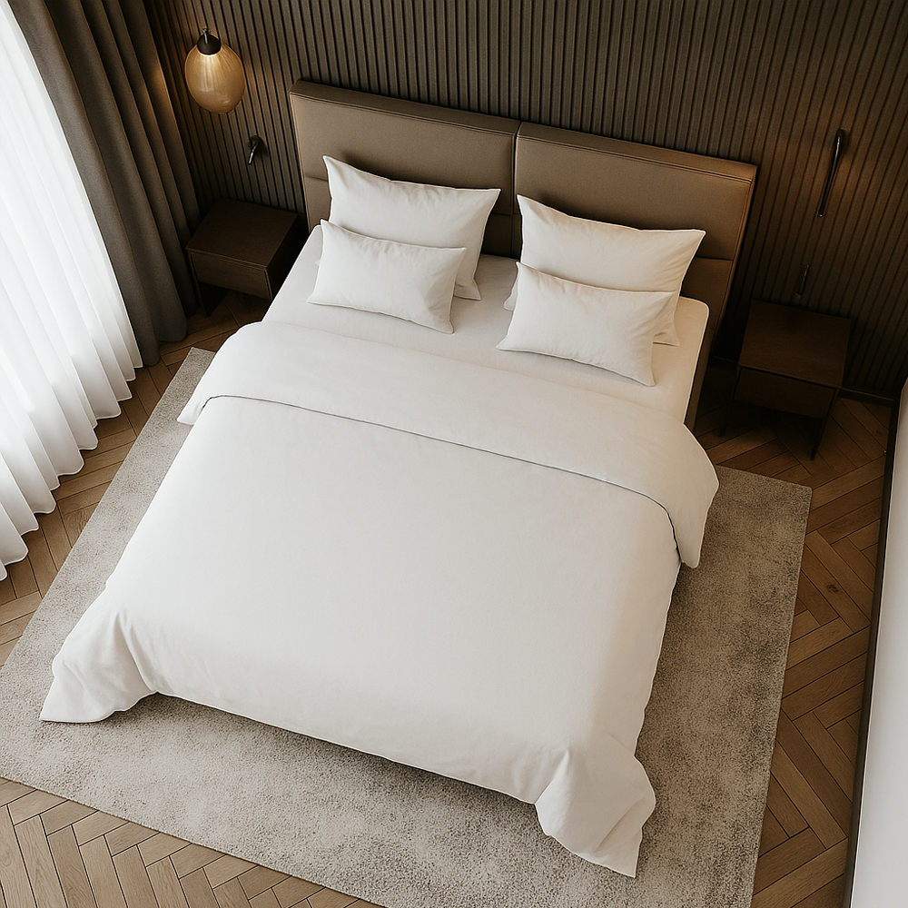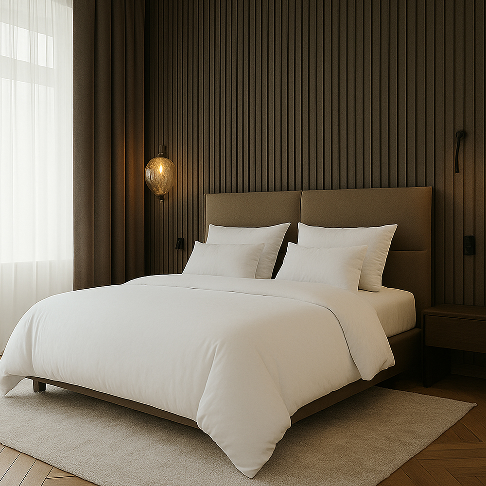 The polycotton duvet cover combines the best of both polyester and cotton, offering a balanced blend of softness and durability. The cotton provides breathability and comfort, while the polyester enhances the fabric’s resistance to wrinkles, shrinkage, and fading. This makes the duvet cover easy to care for and perfect for both everyday use and long-term wear. Available in various thread counts (e.g., 200, 300, 400), allowing flexibility to meet different levels of comfort and quality. Ideal for both residential and commercial use, polycotton duvet covers are versatile and practical, offering great value for money.